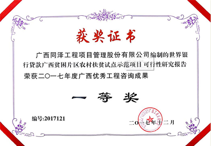 世辦銀行貸款廣西貧困片區(qū)農(nóng)村扶貧試點示范項目可行性研究報告榮獲2017年度廣西優(yōu)秀工程咨詢成果一等獎