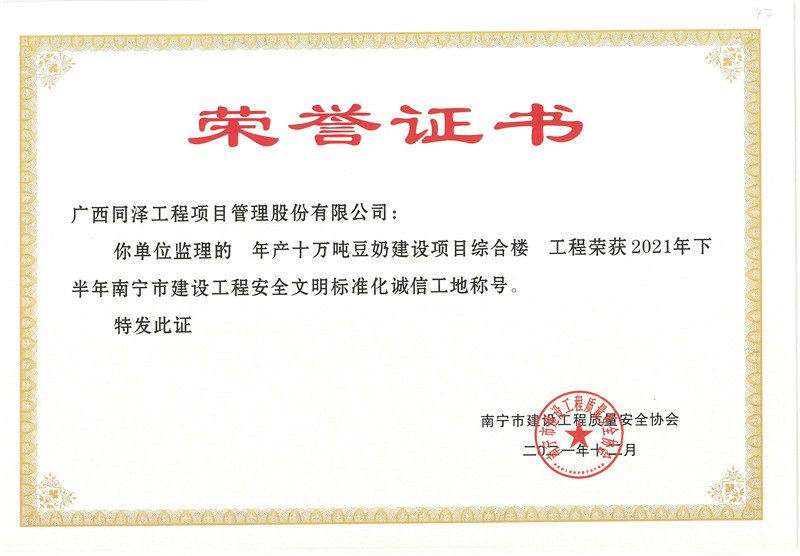 年產(chǎn)十萬噸豆奶建設(shè)項目綜合樓項目榮獲2021年下半年南寧市建設(shè)工程安全文明標準化誠信工地稱號